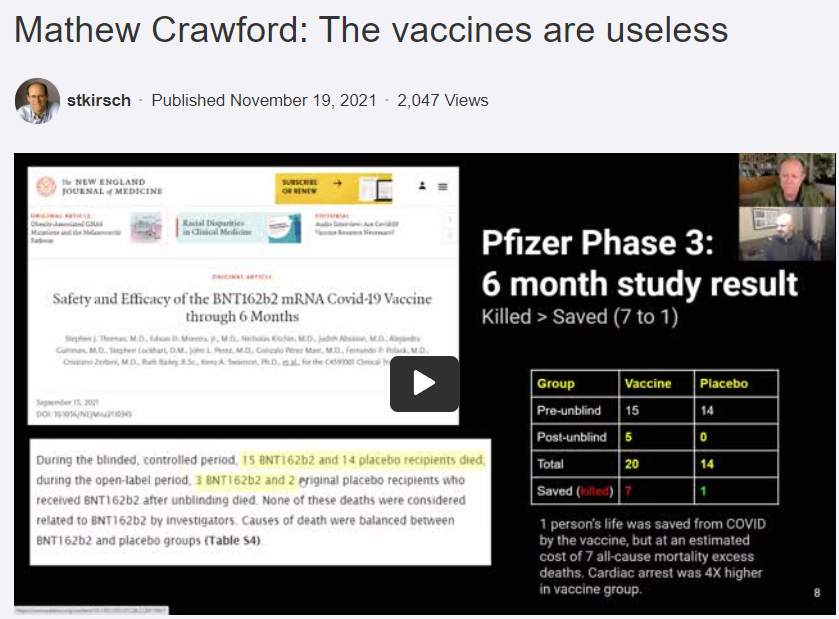 I am still managing fallout from a complete home flooding, and will be for several weeks, so it is hard to keep up with all of the topics I would like to analyze and document, but today I took the step of interviewing with Steve Kirsch to at least lay out the story of the false evidence of vaccine efficacy. In doing so, I introduced several pieces of the story that I believe will be new to many people, including even RTE readers.