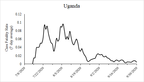 In late July, citing the World Health Organization's claim of HCQ's lack of efficacy, Uganda dropped HCQ as their standard of care for COVID-19 patients. After that decision, during the last eight days of July, Uganda saw its first six COVID-19 fatalities. The cases were not growing so fast as the deaths as Uganda's case fatality rate (CFR) skyrocketed from the lowest level in the world to among the very highest at nearly 10%.