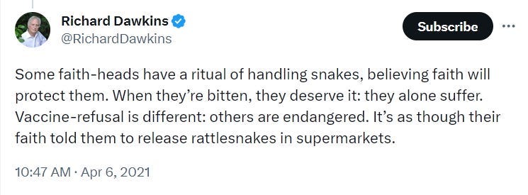 VIPs like Dawkins and Žižek are not “divisive.” They are very important A-list persons who are committed to universal human rights, and freedom of speech, and all that kind of stuff, unless, of course, the authorities announce that they need to go full-blown totalitarian and lock down and segregate and censor everyone because of a virus with a 99.8% survival rate, in which case, you know, “Sieg fucking Heil!”