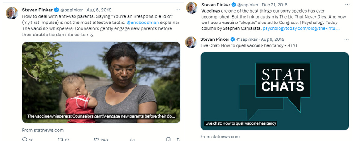 This description (both freaky and miraculous) stands out as emphatic given that Pinker routinely dismantles paranormal replacement of rationality. But Pinker has a greater love of talking down to other members of what he deems "our sorry species" (below). What else stands out is the way Pinker began to target "anti-vaxxers" between the inception of the IDW and the outset of the plandemonium.