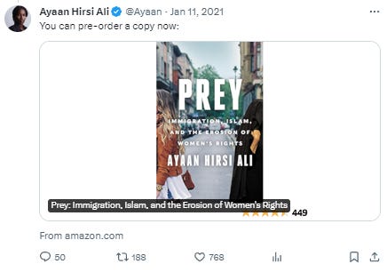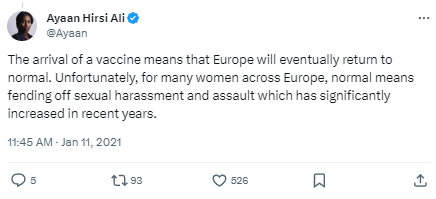 Ayaan Hirsi Ali made the evidence-free claim extremely early on that the arrival of the vaccine would return everything to normal, including sexual assault of women in the same breath.