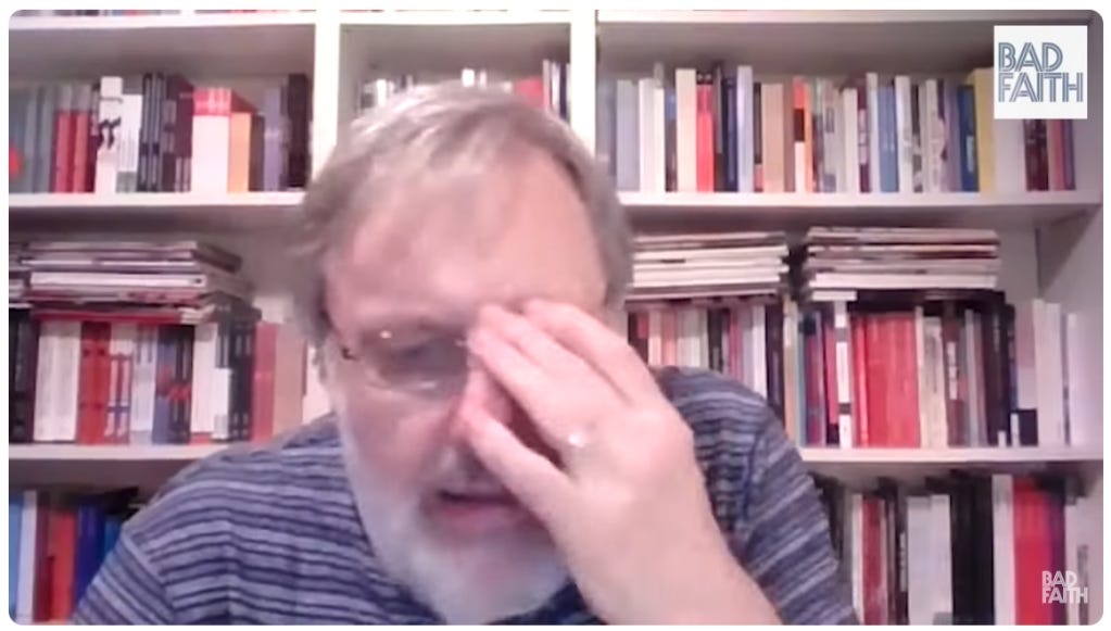 You can watch Slavoj getting extremely worked up in support of Covid “vaccine” mandates, and mocking people who care about “silly” things like their personal bodily autonomy, with Briahna Joy Gray in 2021, if you think you have the stomach for it …