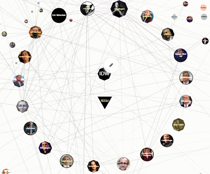 You don't need to pass through Bannon to connect the dots between the IDW and the most prominent members of the PayPal Mafia (henceforth "PP Mafia"). In particular, Eric Weinstein, who seemed to take the role of "leader of the IDW", [supposedly] worked as the head of PP Mafia member (Peter's) Thiel Capital Management.