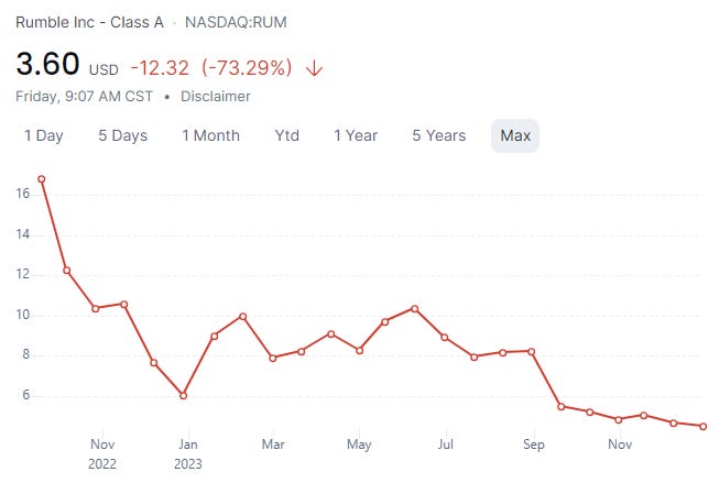 Dave Rubin says that he didn't take the vaccine, but among the IDW, Rubin really only holds intellectual sway with dog walkers. But Rubin was the (chosen?) founder of Locals in 2019, riding the wave of the IDW into the plandemonium. Locals was acquired by Peter Thiel-backed Rumble in October 2021. That's quite an exceptionally rapid acquisition from the founding date. But then Rumble quickly moved to public trading in September 2022, then quickly lost nearly 80% of its IPO valuation.