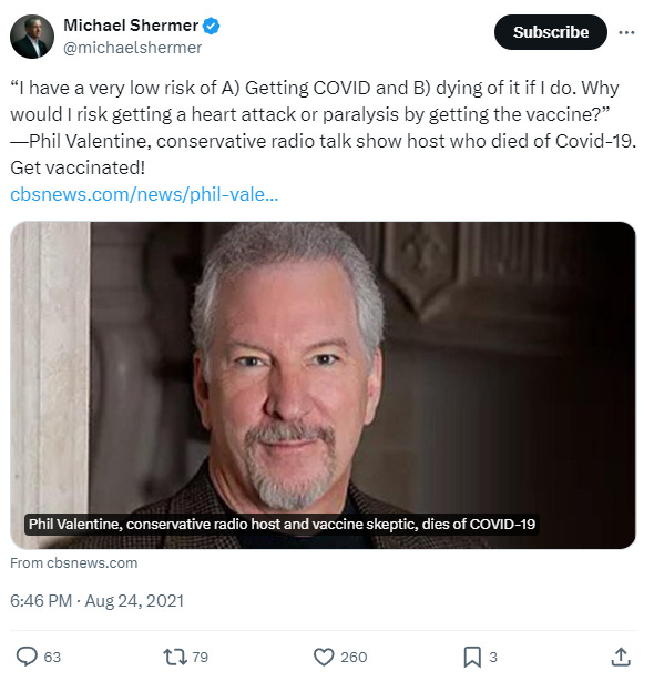 Finally, as a counterpoint to all this observation of motivated vaccine pushing, I'll give IDW member Michael Shermer his say, which was codified in 2022 in a book that anchors conspiracy theory as irrational. A few months later, WooDawg took his toys and went home because he doesn't want to be part of conspiracy theorizing. Interesting timing, would you say?