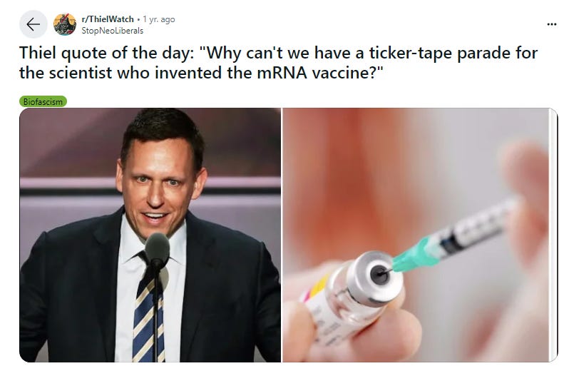 That interview promoting ticker tape parades is from December 7, 2021, long after many of us were calling for a conversation about the seriousness of the data following the mass human experiment. And I'm fairly certain that Thiel knew about the questions I was raising, specifically, because I was talking to half a dozen people who know him or worked for him. Yet, Thiel specifically seems to want ticker tape parades to come back so that we can celebrate mRNA transfection technology?
