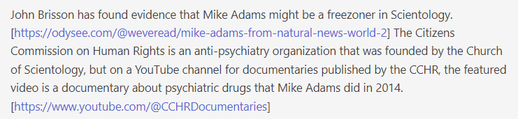 Here is a link to that video, for those who want to check it out. The video discusses claimed evidence that both Alex Jones and Mike Adams are "free zoners" relative to Scientology, meaning that they practice some Scientology beliefs (sort of like the way the Nation of Islam practices Dianetics), so Scientologists don't stay away from them like they do with "suppressive persons" (like me). Given all that I've read and documented (a hundred pages aside from the big picture graph) about Scientology this year, I suspect these relationships are accurate.