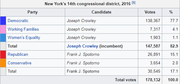New York's 14th District has a population of around 700,000 and in 2016, 178,132 residents voted with incumbent Joe Crowley receiving 83% of those votes (compared to the Republican candidate's 17%).