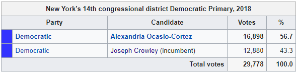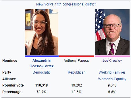 If that seems weird, it's even weirder that where AOC "defeated" Crowley was actually the primary election. AOC received 15,897 (since updated to 16,898) votes (about 11% of the number of votes Crowley received in the 2016 election) to Crowley's 11,761 (since updated to 12,880) votes (about 8% of the number of votes he received in the 2016 election).