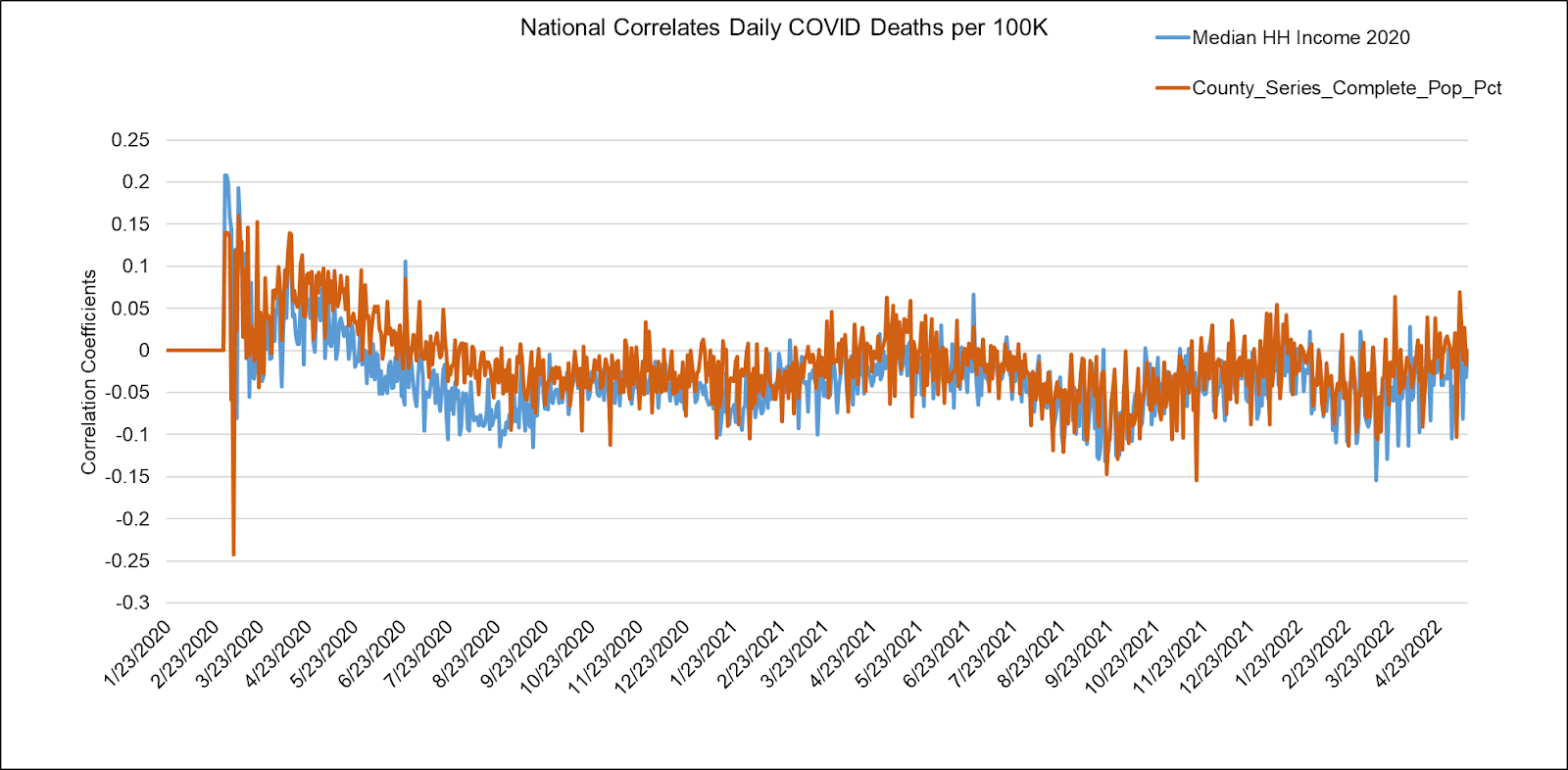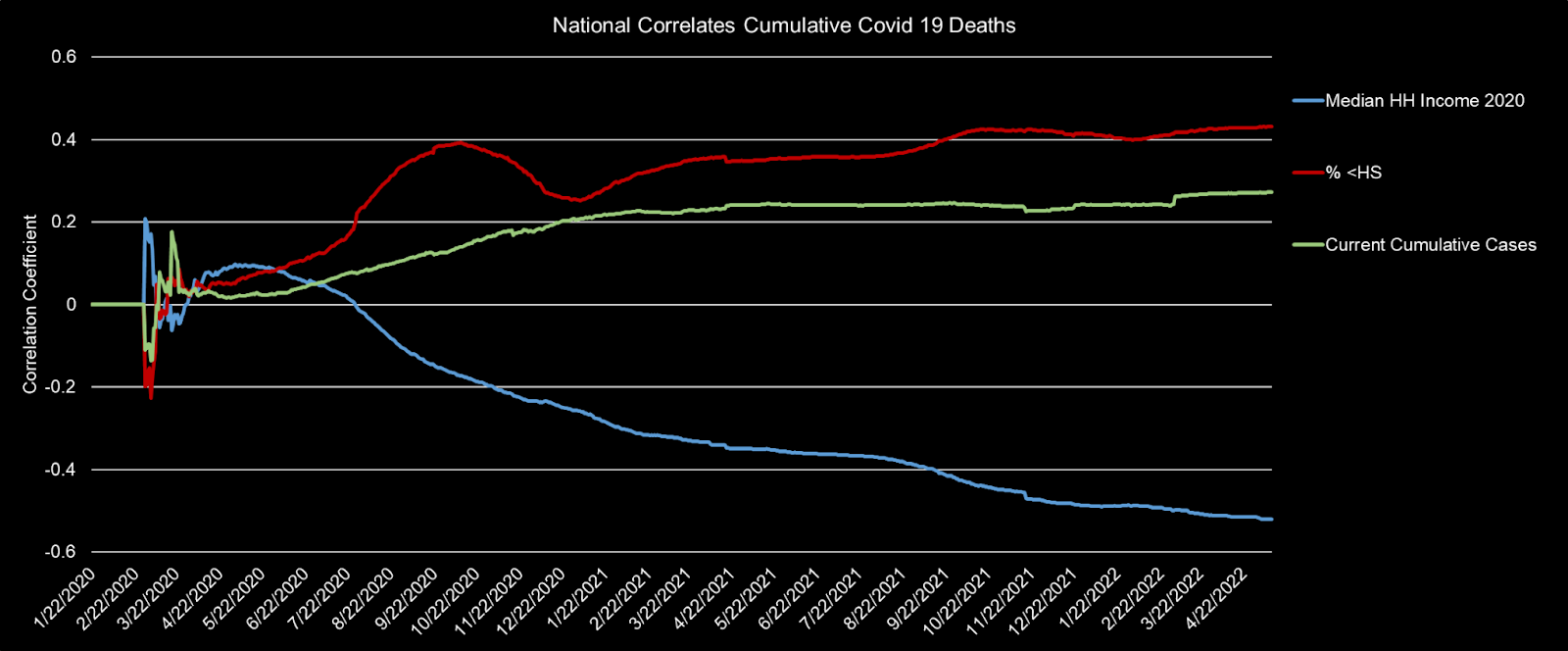 Further, we can see the magnitudes of correlation between COVID-19 county income and education levels grow in a sustained way throughout the pandemic. These correlations are even stronger than the correlation between COVID-19 cases and deaths!