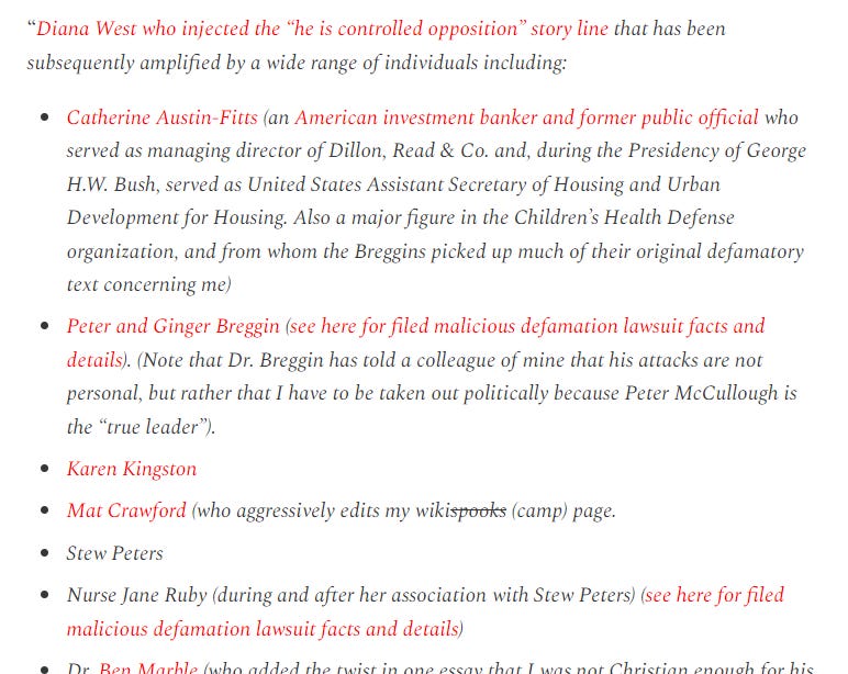 Back in August of last year, I was alerted to Robert Malone grouping me into a "hate cult" that was supposedly terrorizing him. The claim (above) has been edited multiple times, but it is still false and defamatory. My Substack income has since plummeted by around $17,000 per annum, and instead of being more focused on statistics that could sway minds and save lives, I'm forced to research the details of people involved in the Medical Freedom Movement (MFM) to unravel the form and level of control of the dissidents.