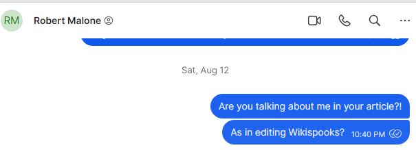 Now, if you go to Robert Malone's Campfire Wiki page, you can see the entire history of edits of his page. There are scores of edits, but none from me since 2021, and none that I suspect anyone would characterize as negative, much less aggressive. To be clear, I have only one account and have not edited the wiki in any way aside from directly through my own account. All of the more recent edits (the most recent of which is a full year old), were made by Liam Sturgess, whom I generally trust as a good documentarian, but in no way directed to make any edits. I wasn't aware of his work on the page, and I haven't even bothered to look through to see if there is anything that would look anything but neutral. One way or another, you can note that Malone has not protested any of the information, which all seems pretty well documented, with 45 total citations.