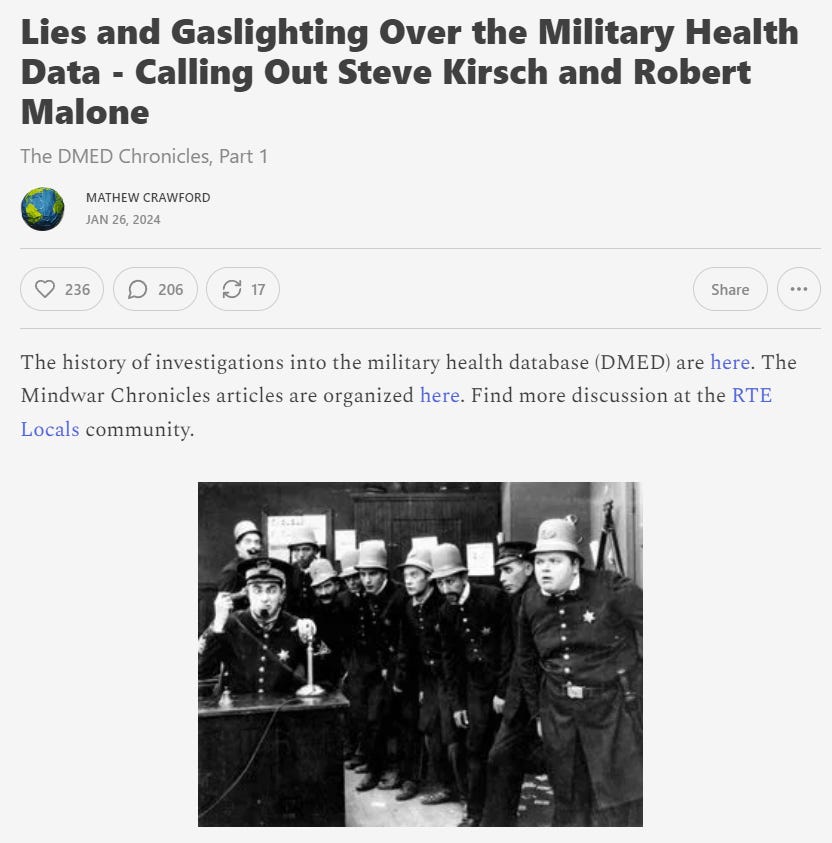 My findings did not fit the narrative promoted by the whistleblowers and their attorneys of ~10x increases in illness among military personnel (who was going to believe that, anyhow?), though there were still exceptional signals of harm—yet essentially nobody in the MFM seems to use the graphs I put together at all. Worse, I began to accumulate observations of military intelligence running psyops supporting the original incorrect claims of the whistleblowers, and the MFM leadership went hands off the topic. In multiple cases, I was told this was due to an intelligence directive. Why on this very round Earth would the dissident movement be taking orders from the intelligence agencies of the government that thrust all this on us?