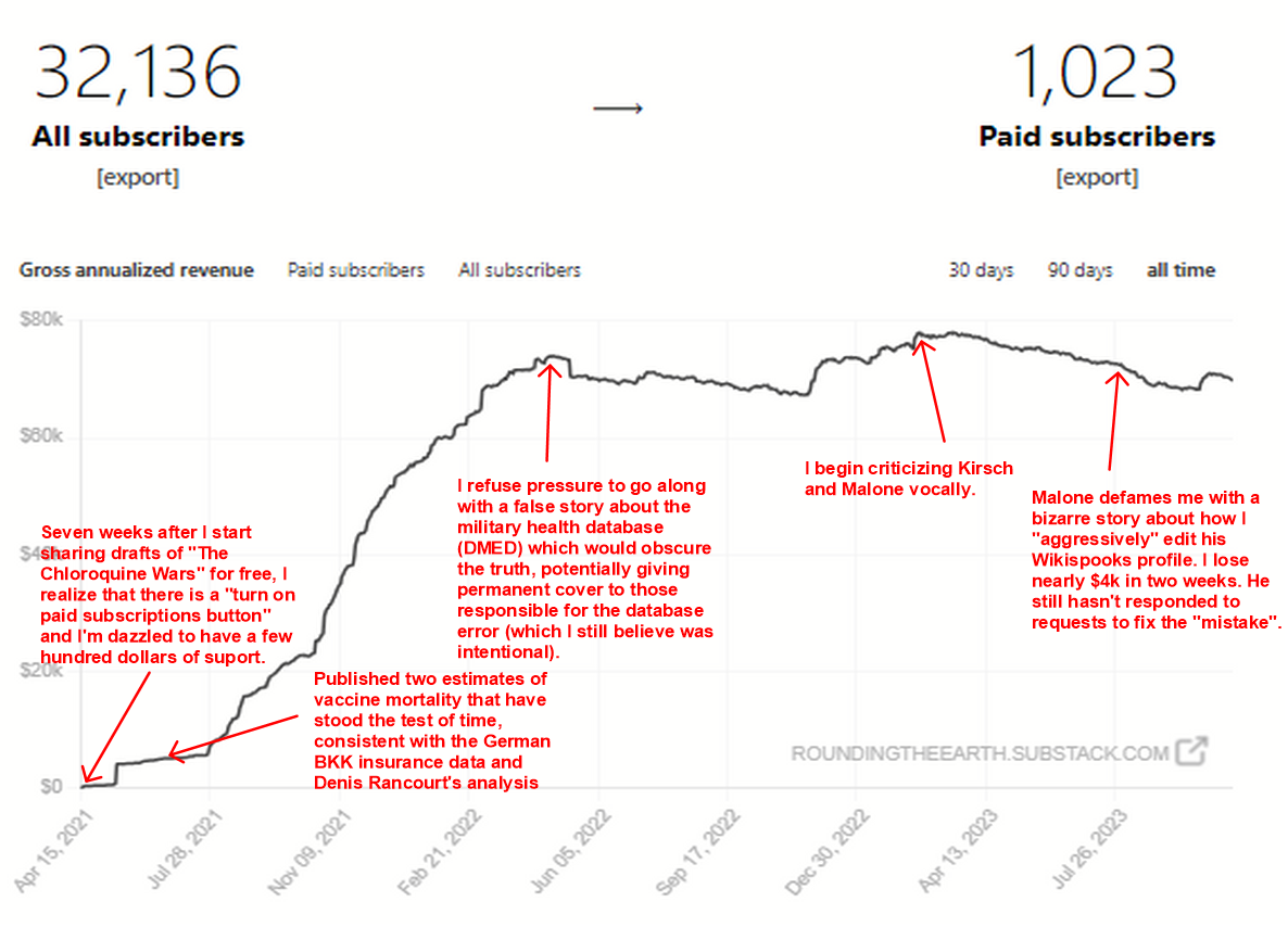I'll share the entire history of my Substack revenue, out of which is discounted 13% by Substack and Stripe, and I pay a part time employee from the remainder. What's left is a thousand dollars a week, which fluctuates. It comes out to around $15 an hour, but closer to $8 when you consider that I started all this work more than three years ago, a year before the trickle of revenue began, and long before it reached the, "I'm not going along with the DMED lies" local maximum.