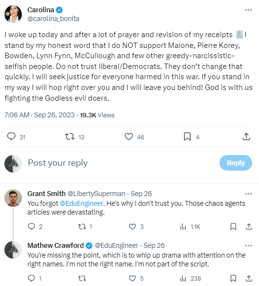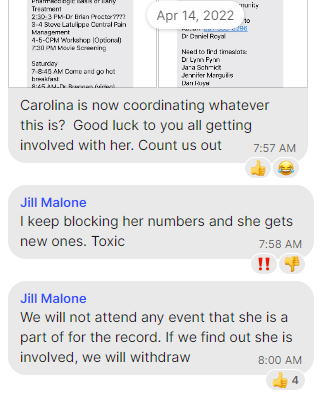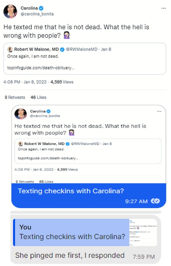 Does anyone wonder why I went from making several calls a day about everything going on to rarely picking up the phone with most of the MFM heroes? The last time I talked to Robert Malone, he screamed into the phone, demanding that I give up the name of the person who informed me about the connection between he and Carolina Bonita that I slipped into an article. He had written about her as a Chaos Agent, and supposedly had her investigated by Gavin DeBecker, but I suspect that what we're looking at is a staged fight designed to launder certain associations.
