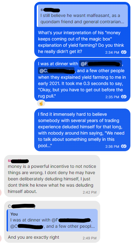 This is not about money. If it were, I would have spent 2021 playing the same game that Sam Bankman-Fried described as something like, "money come out of magic box, could go on forever." When I heard about yield farming—later than I would have had I not spent a year already on pandemic research—I had a million dollars in capital and quickly computed that I could make several million from that stack in 2021, with a full exit by early 2022 when smart traders should begin to expect "Crypto Winter" rug pulls from the cyclically arranged Ponzi schemes.