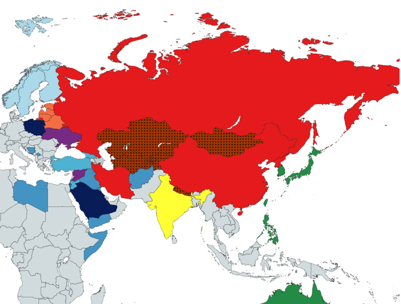 Focus on the blue areas where U.S. military action took place. Sure, the U.S. handed over Afghanistan ("the graveyard of empires") to China (maybe after training the Taliban *cough*), but otherwise, U.S. involvement seems perfectly strategic in a game of "who controls the spoils of the post-dollar belt and road".