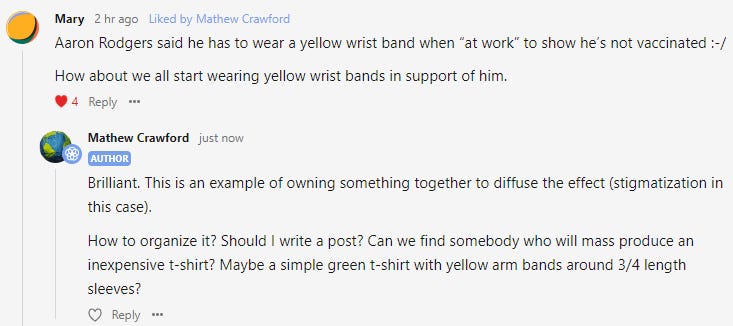 After last night's article on Aaron Rodgers and his vaccine hesitancy and choice of early outpatient medical care [that seems to have been quite effective], a clever RTE reader came up with a great idea: yellow wrist bands for medical freedom. This is the moment. Own it.