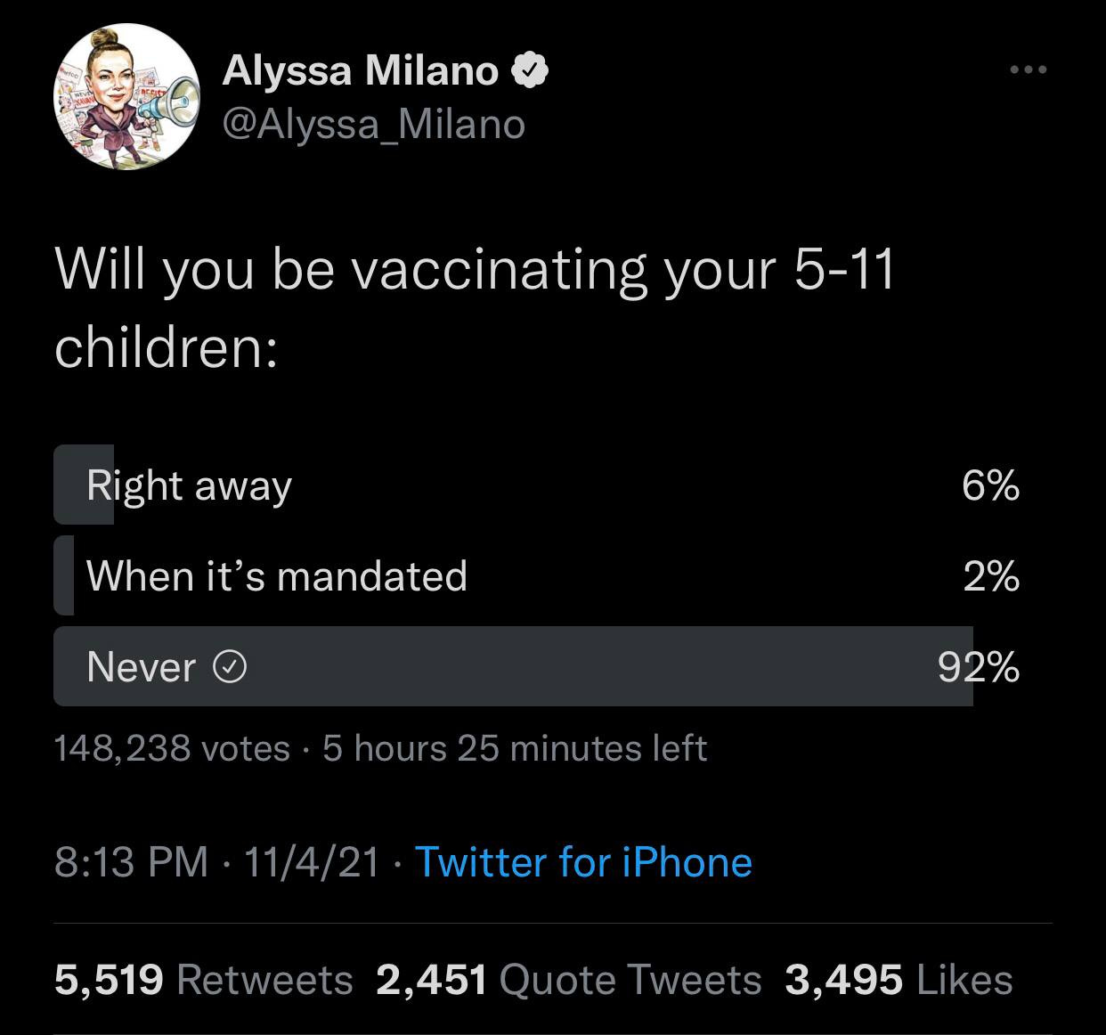 And that tweet poll from Alyssa Milano is VERY encouraging—92% of HER audience, likely almost 100% Covidians! Coming for the children may backfire big-time 🤞